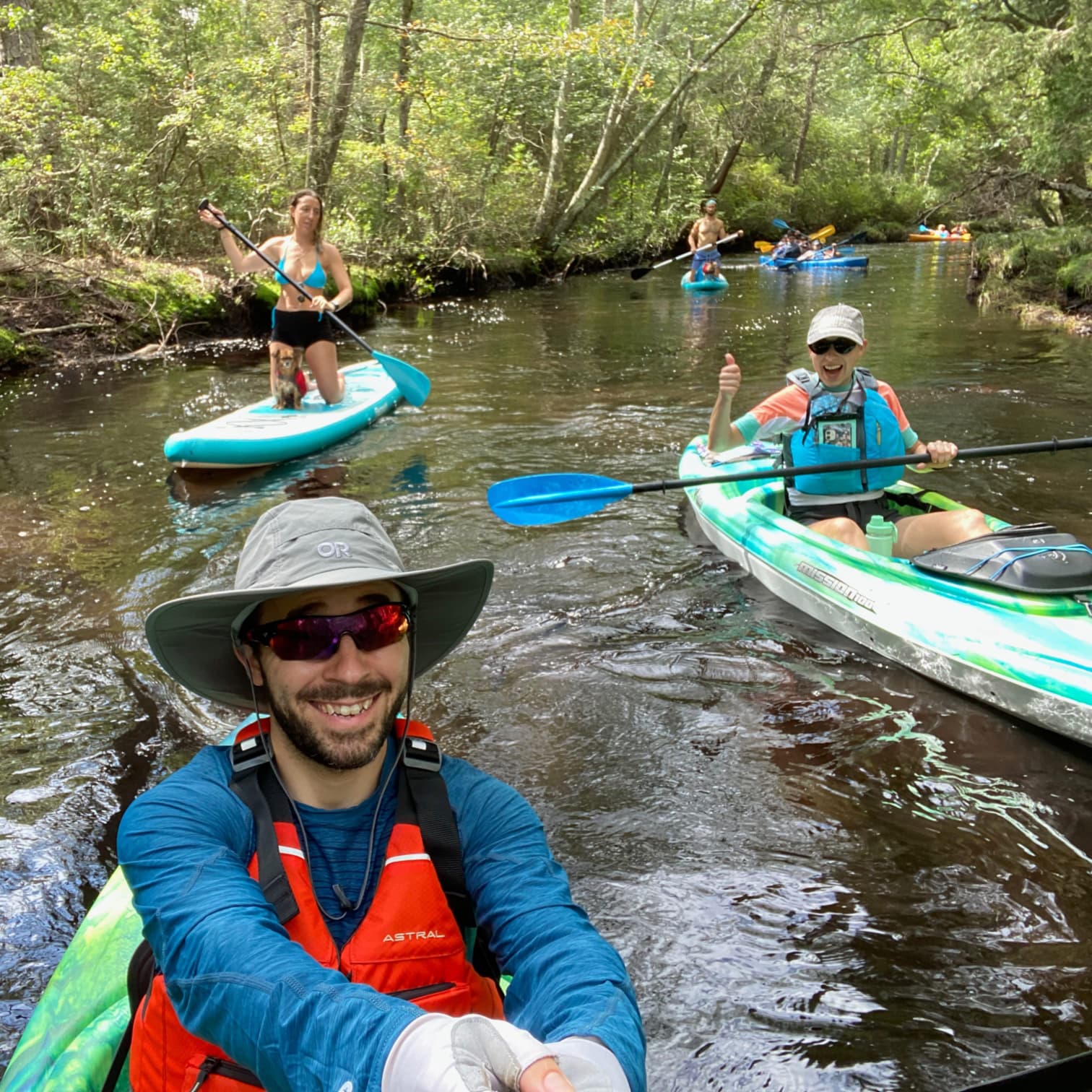 Wading River is the closest and also the most forgiving river in the area. I was not certain paddle boards would be a fun time navigating down the twists and turns of the river, but we were determined to make something out of the day. Oh, and my friends brought their two small dogs! Those pups were troopers, too, standing atop the paddle boards for a 5 mile downstream float. Find our route here.