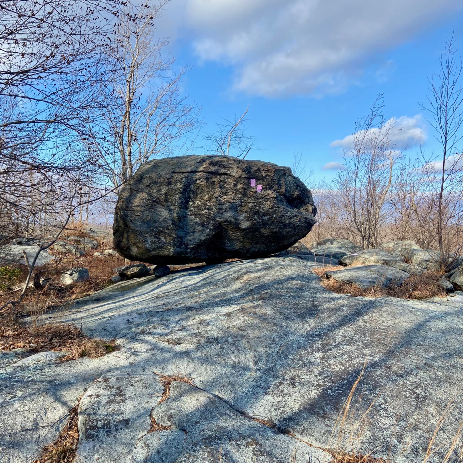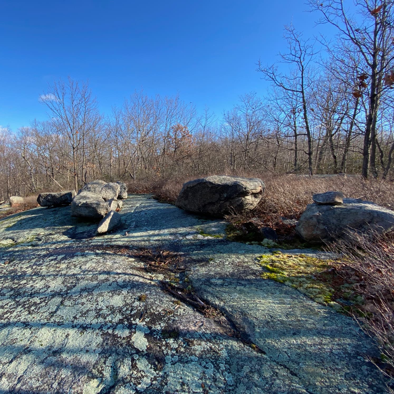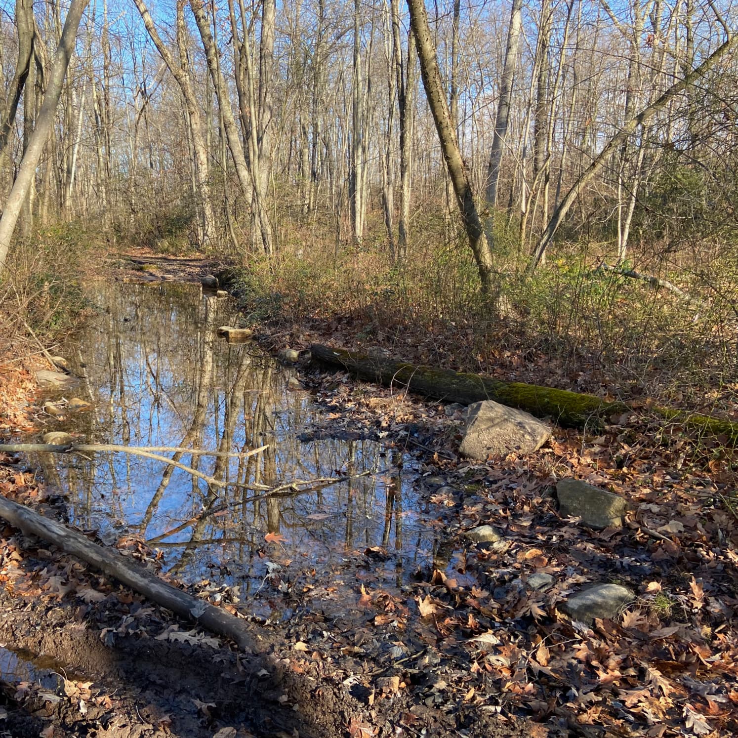 We hiked the “candy cane” trail, e.g. the one which had a red/white slashed blaze. It felt appropriate on the day after Christmas! Finding the trail, though, was not a great experience as evidenced by our first photo in the gallery below. We ended up on a fire road instead, which was filled with quite a few deep and water-filled holes. However, once we did reconnect with the trails proper everything was well-blazed and easy to navigate. Lots of twists and turns on the trail, too! Every thousand feet was a blaze directing a sharp right- or left-hand turn.