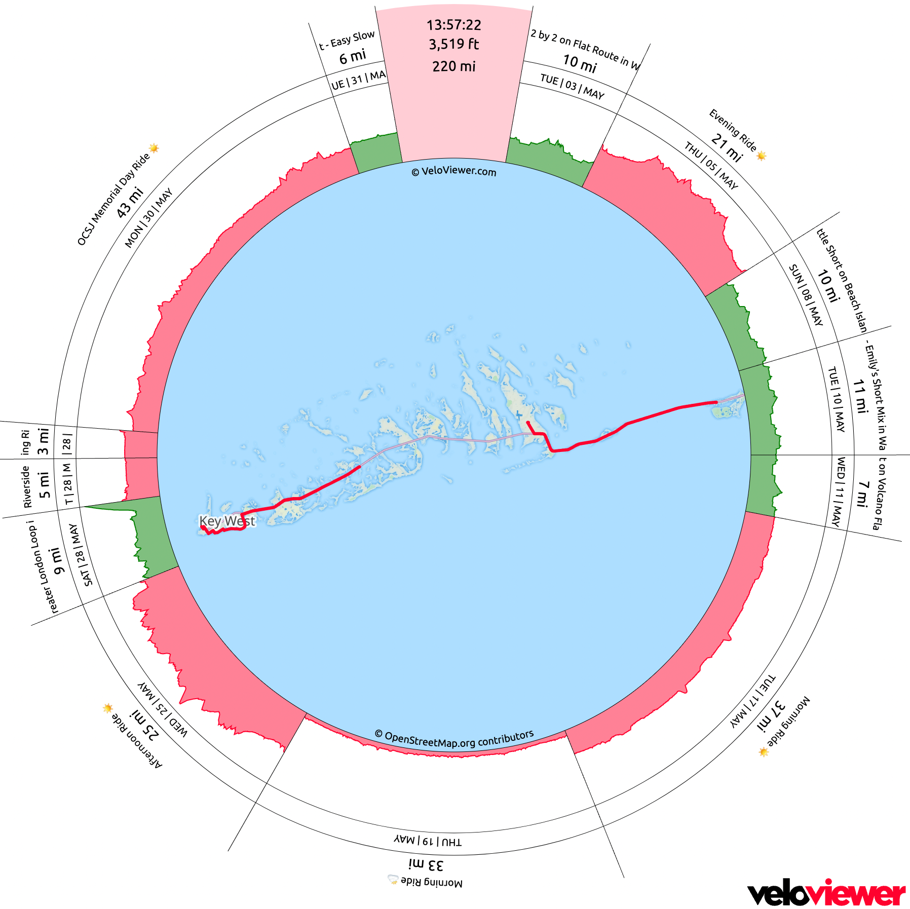 A trip to Key West and riding on the Overseas Highway (US Rt. 1) always makes for a good month in biking! Despite the time off for that vacation, I managed to just barely eclipse my 2021 mileage at this same point last year - 1,005 miles for this year versus 994 for last. Certainly an improvement against where I was in February or March.