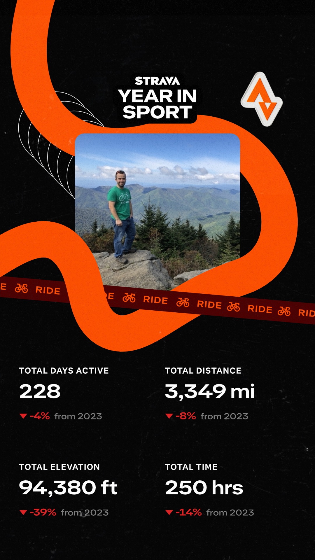 I did manage to ride more outside than inside on the trainer in 2024, though! 2,195 outdoor miles in 2023 became 2,199 outdoor miles in 2024. Must be the extra miles I pick up mountain biking this year, which was a new hobby starting in November 2023.