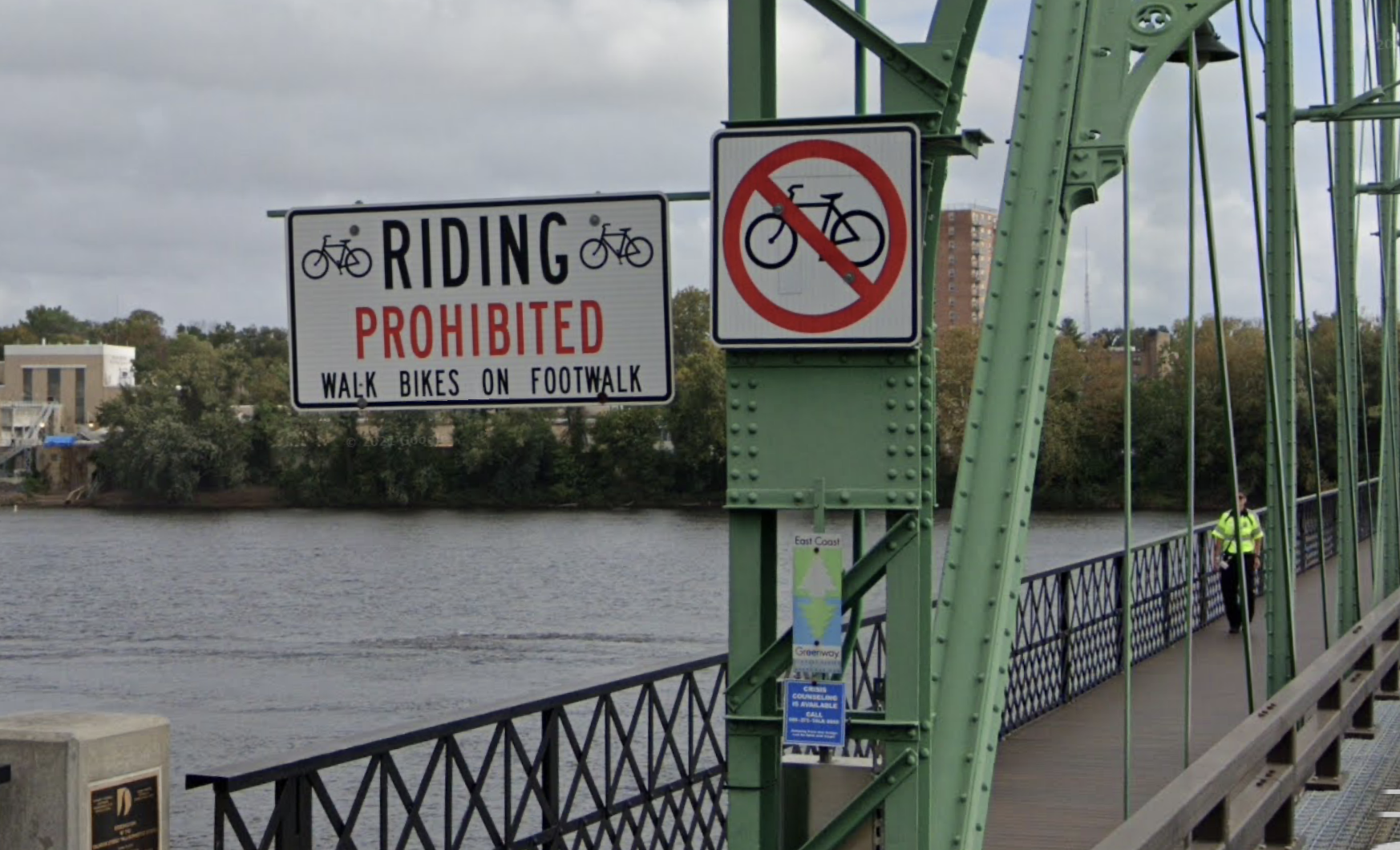 I share this because the bridge which ended his attempt was right near me. Appears to be the Calhoun Street bridge connecting Morrisville, PA into Trenton. What is curious about the video is the mention of this being the only bridge in the area which allows cycling across. That’s not true, not on this bridge and most (all?) of the other open-grate bridges in the area. Cycling across the open-grate is banned, and cycling on the pedestrian path connected on the side is also banned, as you can see in this Google StreetView image: