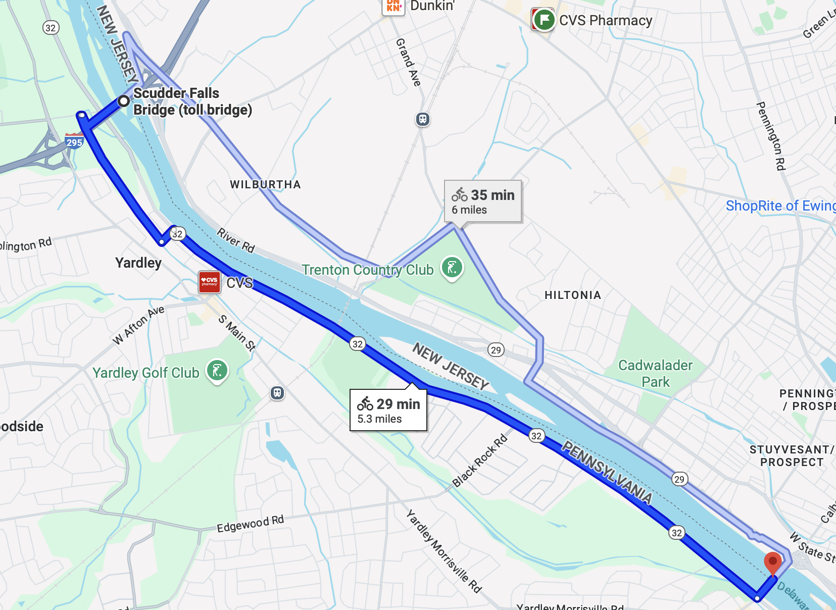 Had they wanted to ride across a bridge, they could have instead gone 5 miles north to the 295 Scudder’s Falls Bridge, which does have a rideable bike path with no need to dismount.